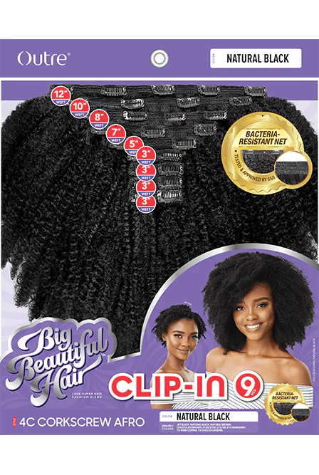 Outre 4C Corkscrew Afro Big Beautiful Hair 9pcs Clip-In is from Outre’s Big Beautiful Hair Clip-In collection. Made with a blend of human and synthetic hair fibers, the Outre 4C Corkscrew Afro Big Beautiful Hair 9pcs Clip-In has a naturally soft texture designed to mimic afro kinky coily 4C hair type.
